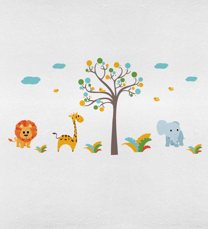 | Médio | Contém: 01 Árvore (57x92 cm), 01 Girafa(26x39 cm), 01 Leão (28x28 cm), 01 Elefante(28x28 cm), 04 Arbustos (média 30x18 cm) e 04 Nuvens (média 19x8 cm). |