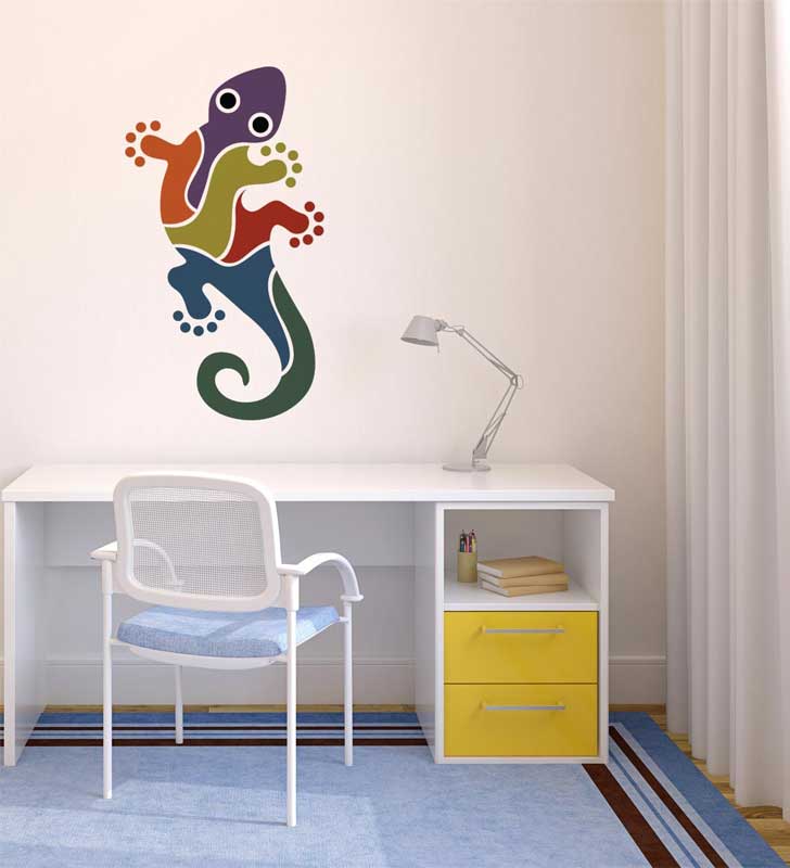O adesivo de parede Gecko, proporciona uma decoração com aspecto exótico ao quarto jovem. Ele tem um réptil da classe geconídeos da família dos lagartos, popularmente chamado de lagartixa. Produzido com muitas cores esse desenho fica muito bonito na parede, lugar favorito dessa espécie.