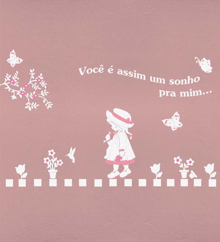 "Você é assim é um sonho pra mim". A frase cheia de romantismo ilustra esse super charmoso adesivo de Parede Menina Camponesa desenhado para o quarto das bebezinhas. Borboletas, flores e passarinhos ajudam a compor uma paisagem serena que vai abrilhantar o quartinho delas.