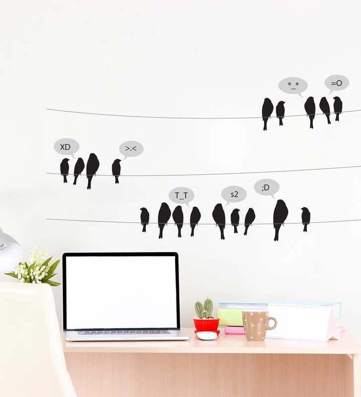 Criatividade é uma coisa que não pode faltar na decoração do quarto jovem. Por isso, esse adesivo de parede Passarinhos Falantes é formidável para ornamentar o cantinho deles. Composto de vários passarinhos pousados sobre fios eles conversam entre sim com linguagem moderna em códigos usados em chats de internet. Muito divertido e autêntico.