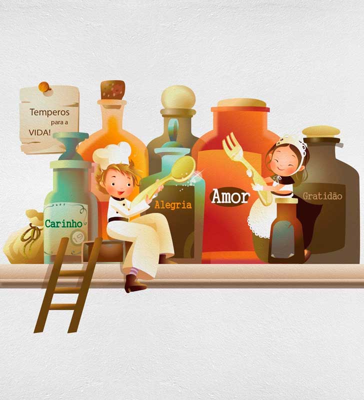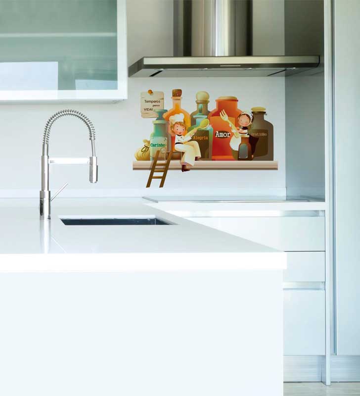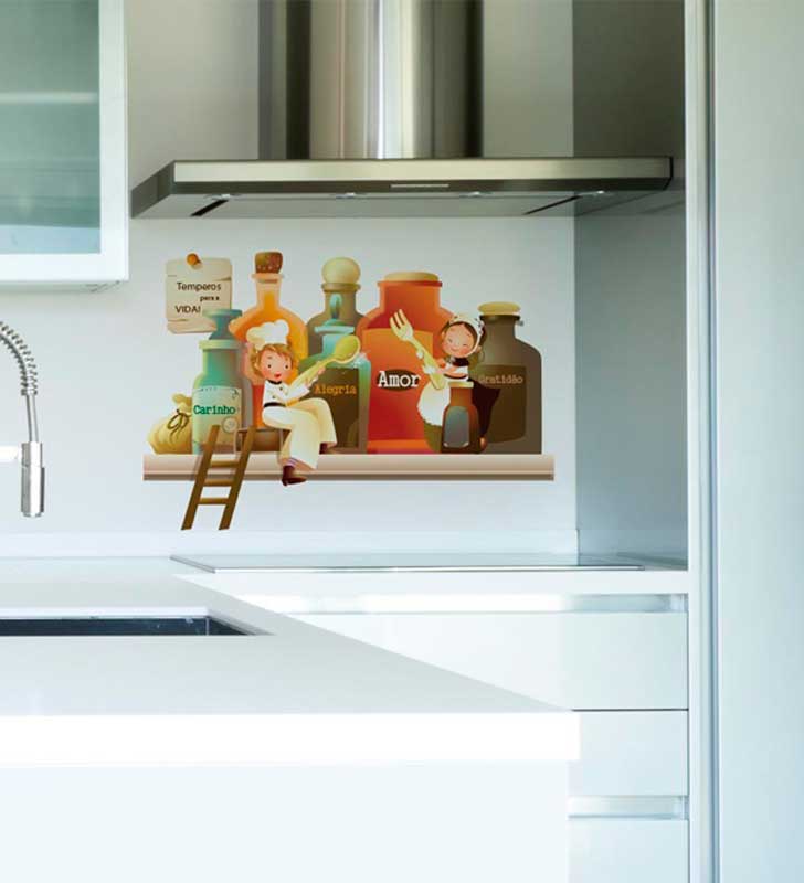 Um alegre casal de cozinheiros se diverte em meio a vários frascos de temperos, condimentos, azeites etc. enquanto se preparam para fazer saborosas receitas. Esse adesivo é uma ótima ideia para decorar a cozinha com um tema clássico que são os sabores. As embalagens coloridas e diversificadas produzem uma linda aparência e astral descontraído.