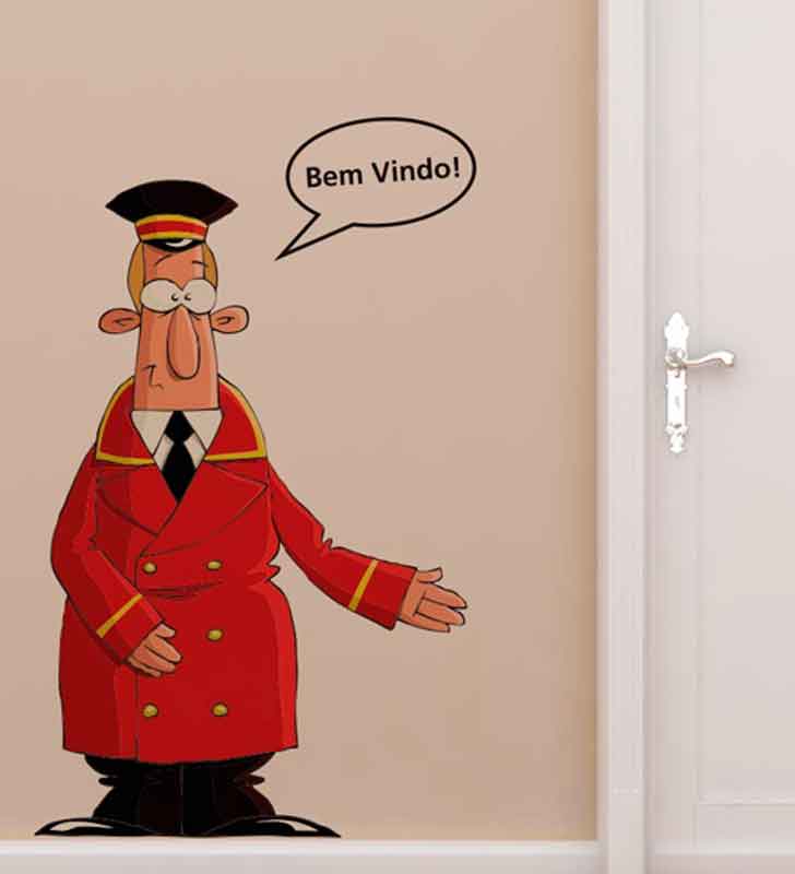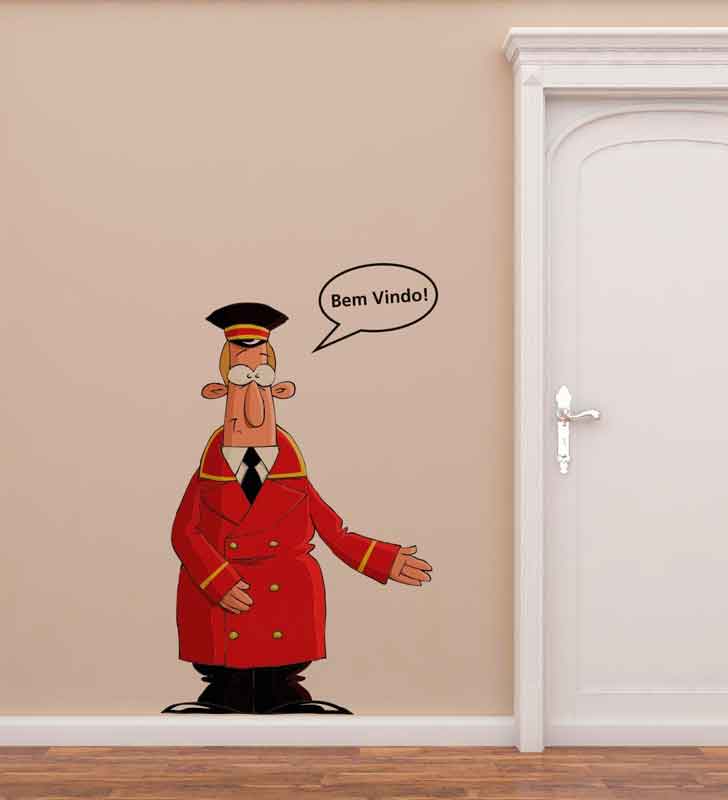 A sala de estar é a primeira impressão que as visitas têm da casa. Por isso, esse adesivo de parede é uma forma criativa de dar as boas vindas. Composto de um simpático porteiro vestido adequadamente com uniforme e chapéu que saúda a todos na entrada. O lugar fica convidativo e divertido.